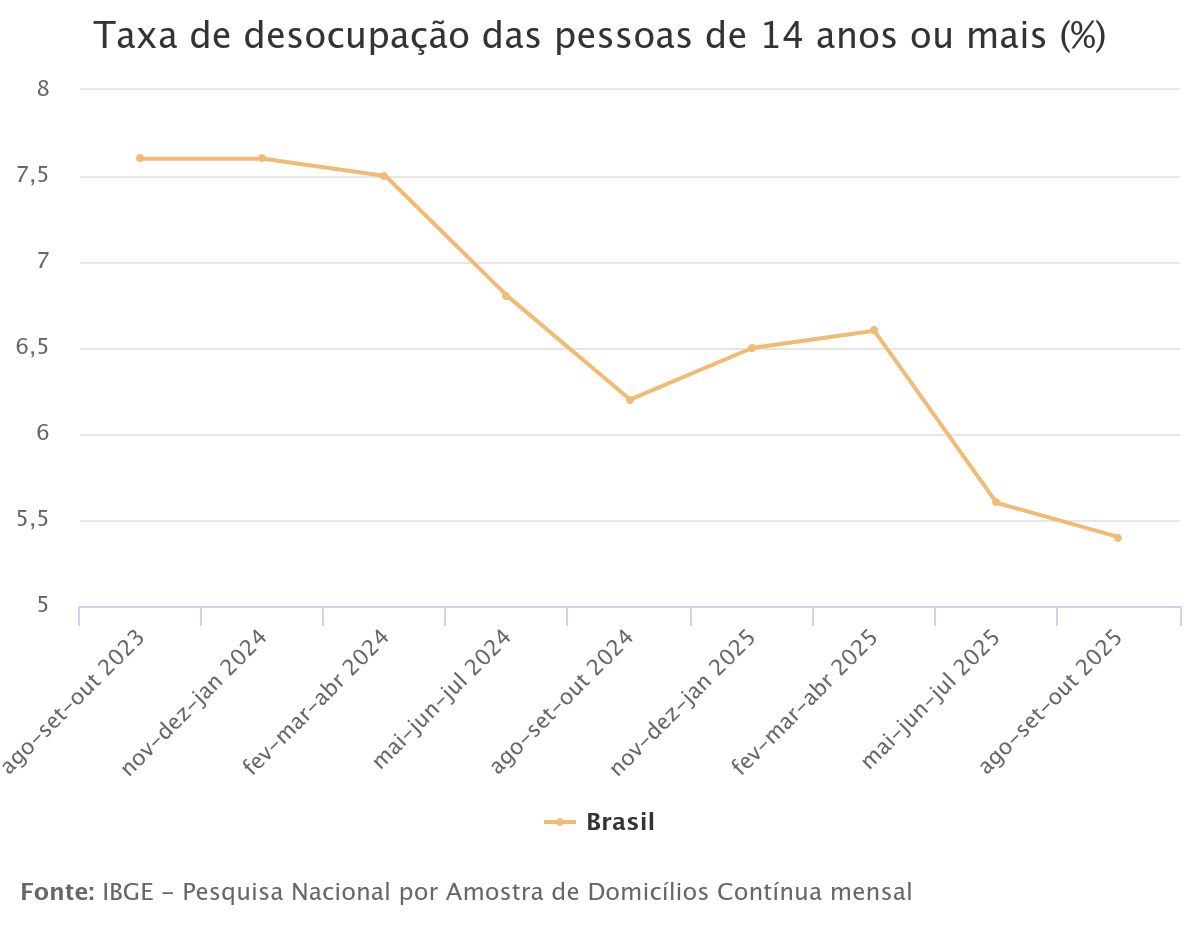 A taxa de desemprego do trimestre encerrado em outubro de 2025 caiu para 5,4%, repetindo a menor taxa da série histórica, que teve início em 2012.