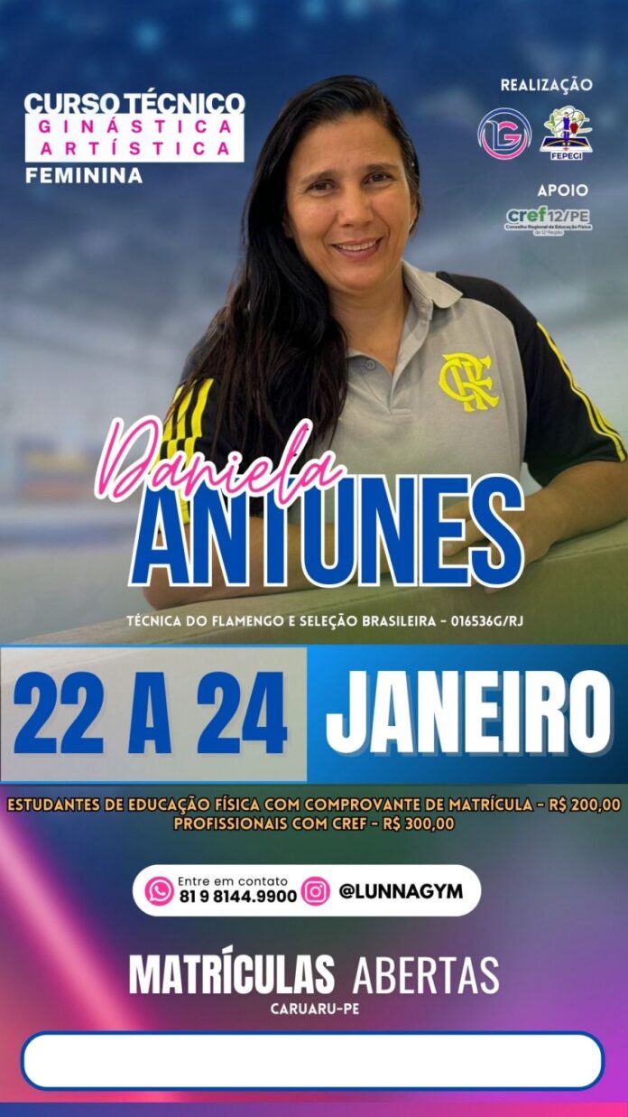 Entre os dias 22 e 24 de janeiro, Caruaru se transforma em ponto de encontro para quem vive e acredita na ginástica artística feminina. A cidade recebe o Curso Técnico de Ginástica Artística Feminina, conduzido por Daniela Antunes, treinadora do Flamengo, profissional reconhecida nacionalmente por sua dedicação à formação de atletas e ao fortalecimento da modalidade.