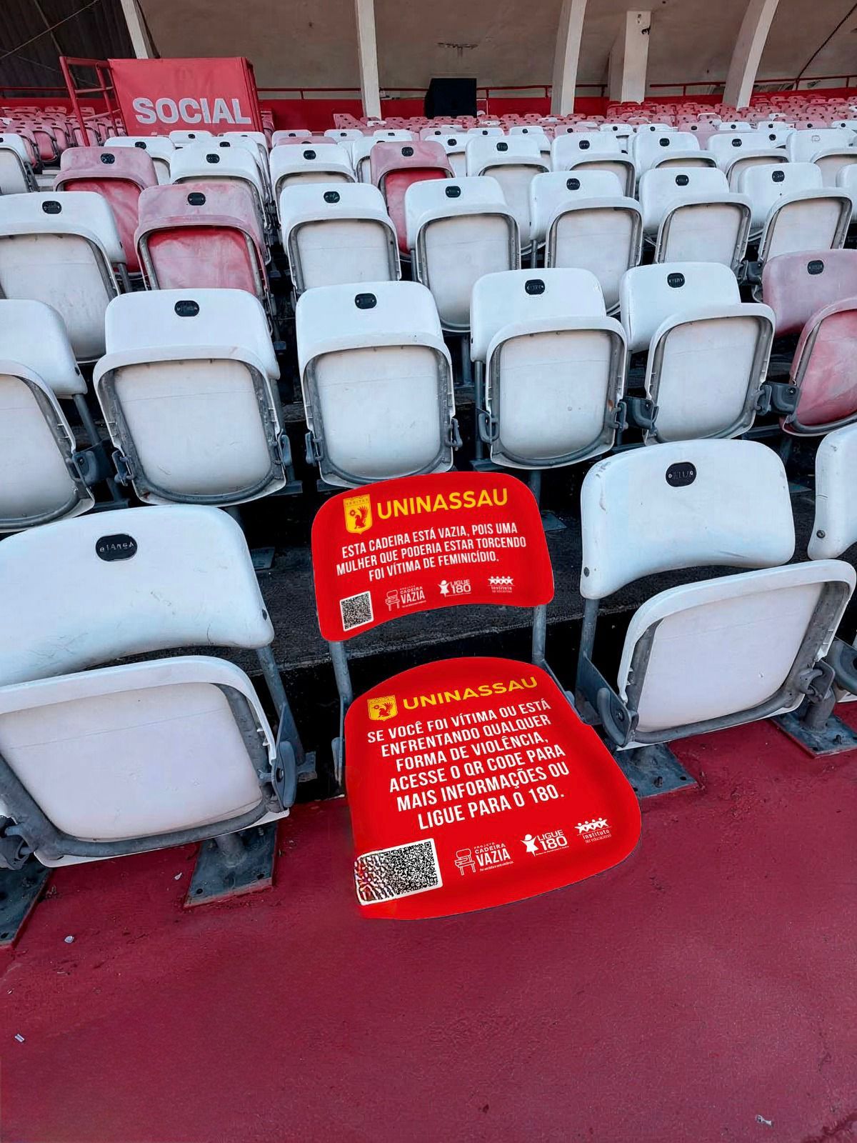Além da intervenção com o banco vermelho, a UNINASSAU instalará duas cadeiras vazias no estádio, cada uma acompanhada de uma frase de impacto que simboliza o lugar que poderia estar ocupado por uma mulher vítima de feminicídio. A ação faz parte de um conjunto de iniciativas desenvolvidas pela Ser Educacional, mantenedora da instituição de ensino, voltadas à prevenção da violência contra a mulher.